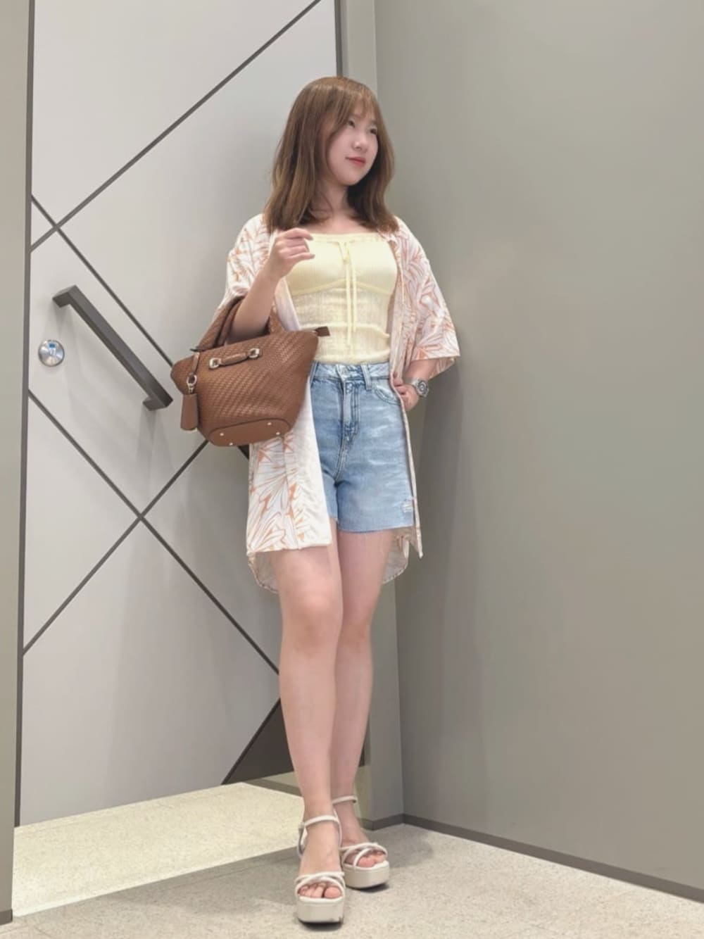 シャツの生地は薄くてとても涼しいです🫧 花柄デザインが夏らしくて、海への旅行にもぴったり!普段使いにもOKです👙 キャミソールはボディラインを綺麗に見せてくれて、伸縮性も◎🤗 薄手で柔らかいデニム素材のショートパンツは、暑い日でも涼しく快適に穿けます☀️ バッグは柔らかくて容量が大きいです。長財布を収納できます👏🏻