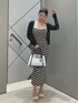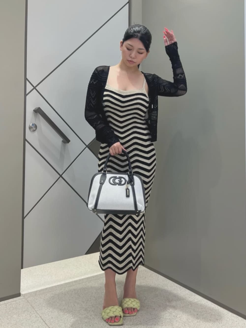 ボーダーラインが特徴のスリーブレスドレス! 大胆なスリットで歩きやすく、さらにセクシー感を演出してくれます🩷!! インナー次第で印象の変化のコントロールも出来るのでおすすめです♪♪ ハンドバッグの落ち着いたカラーリングで大人な印象もプラス♪♪ マザーズバッグとしても活用できる程、見た目以上に荷物を入れられる優れものです!!