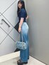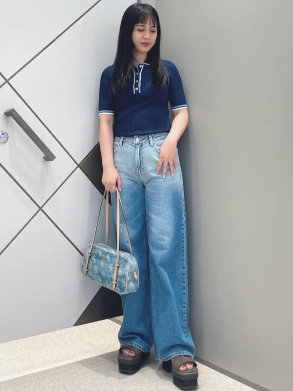春夏も着れる薄いニット素材のポロシャツは細見えするシルエットですがストレッチきいています!袖や襟のラインもポイントです✨ デニムはワイドシルエットでゆったりと着れてノンストレスです♪裾にかけて濃くなるグラデーションも他にはないデザインです👖 人気なデニム素材のバックはguessロゴがプリントされていてコーディネートのポイントに👜♡ハンドル部分の長さ調整ができたり、マチと間口が広く荷物を出し入れしやすかったりと機能性も抜群です!