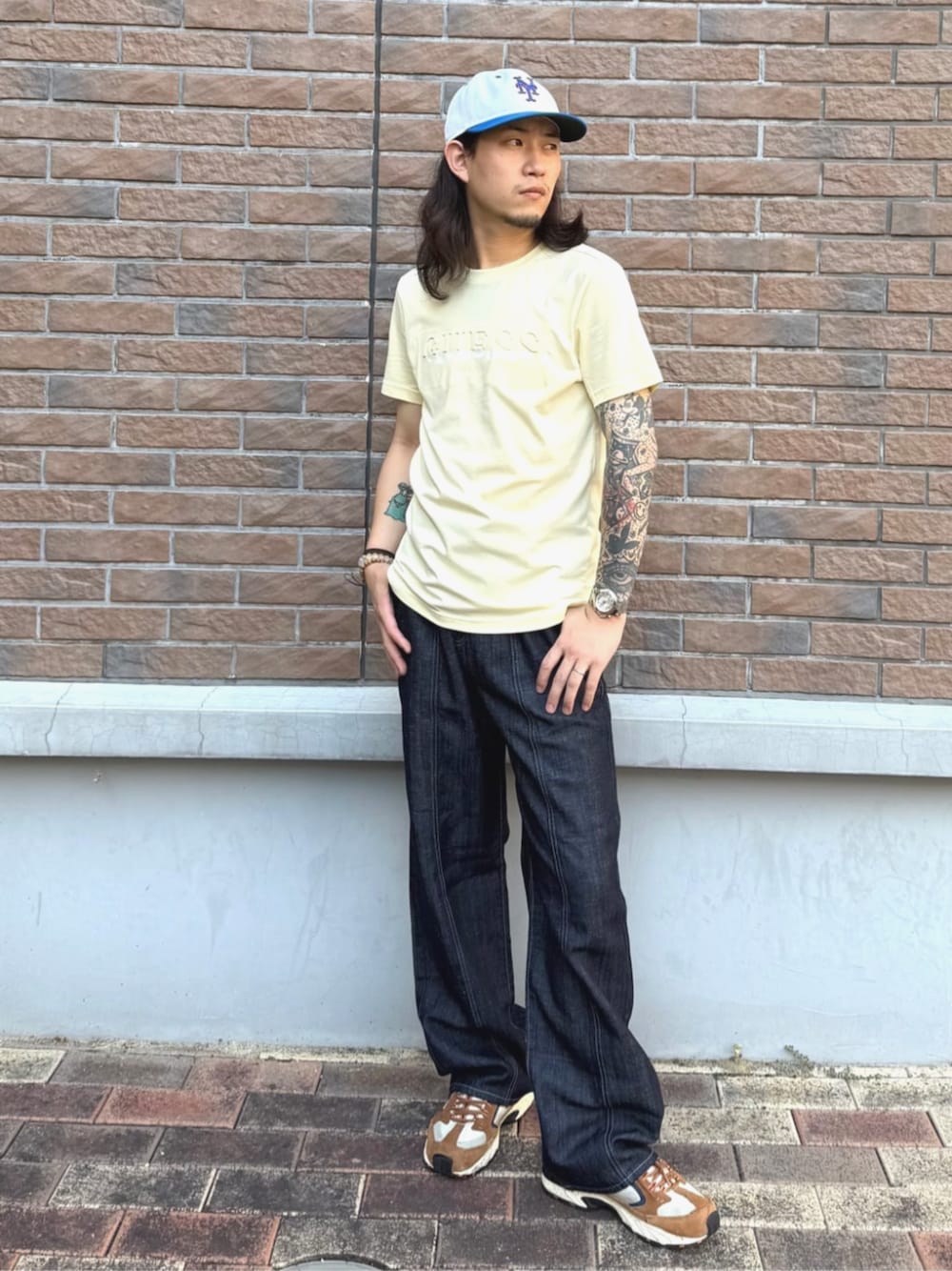 Tシャツのロゴは凹凸感のあるエンボスデザインになっており、シャツやジャケットを羽織るときはインナーとしても着回しやすいのがポイント✨ 若干細身のシルエットになっているので女性の方にも是非オススメです。 デニムは股下から裾にかけてのワイドシルエットがトレンドっぽく、センターステッチが脚長効果やスタイルアップになります。 素材が綿70%麻30%で出来ており、ライトな履き心地で暑い季節でも履きやすいのもポイント✨ ダッドシューズで足元にボリュームを出し、上はタイト下はワイドでシルエットのメリハリを作りました。 夏はコーディネートがシンプルになりがちなので、シルエットや小物で変化を作ってオシャレを楽しんでいきましょう❤️🔥