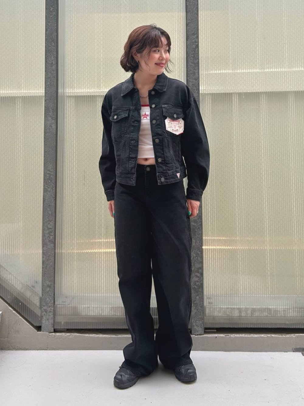 ジャケット(XSサイズ) →ベーシックなデザインなので、ボトムスも選ばず着ていただけます✨ XSでもゆとりはあるので重ね着した上からでも⭕️ ショート丈なのでスタイルアップ間違いなしです! インナー(Mサイズ) →裾を少しだけ中に折ってクロップド丈風に着てます✨ とても伸縮性があるので着心地抜群です! 夏は1枚でトップスとして着ても可愛いです🩷 デニム(28inch) → ワイドめですがストレートシルエットなので脚のラインが綺麗に見えます。 太ももから同じ太さなので裾はロールアップしても⭕️ オーバーサイズなTシャツやタイトなトップスとも合わせやすいです👍🏻