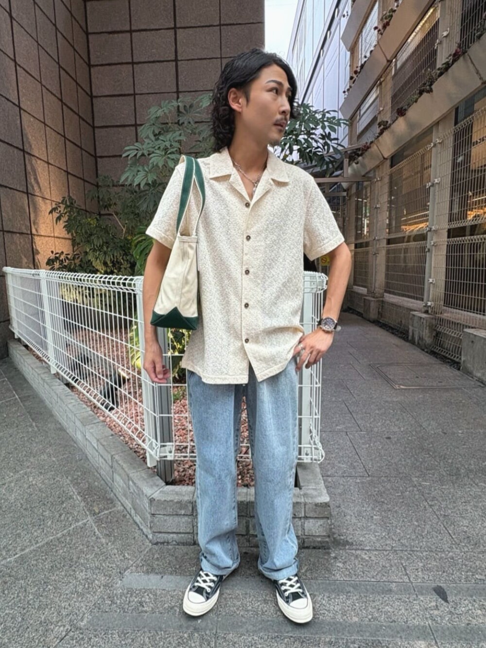 繊細なレース調の生地が 特徴の開襟シャツ。 程良く体に沿うシルエットと 軽やかな素材感が相まって リラックスした着心地に。 デニムやチノパンなどとの相性が良く カジュアルからキレイめまで 幅広く活躍する一枚です!