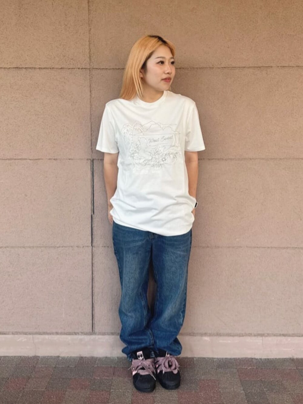 シンプルな組み合わせがやっぱり落ち着きますよね〜 Tシャツの刺繍のデザインが夏っぽくてシンプルで可愛いです! 女性の方でもショートパンツやどんなデニムにも対応できる優れものです♫ デニムはメンズサイズなんで大きめですが今流行りのワイドとして着用していただけますー!