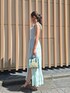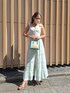 夏らしいフェミニンドレスはリゾートでも映えるミントグリーンのカラーがとてもかわいいです! バックがギャザーになっているので楽に着ることができます、 ヒールに合わせてフラットシューズに合わせてもGood!