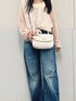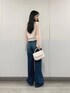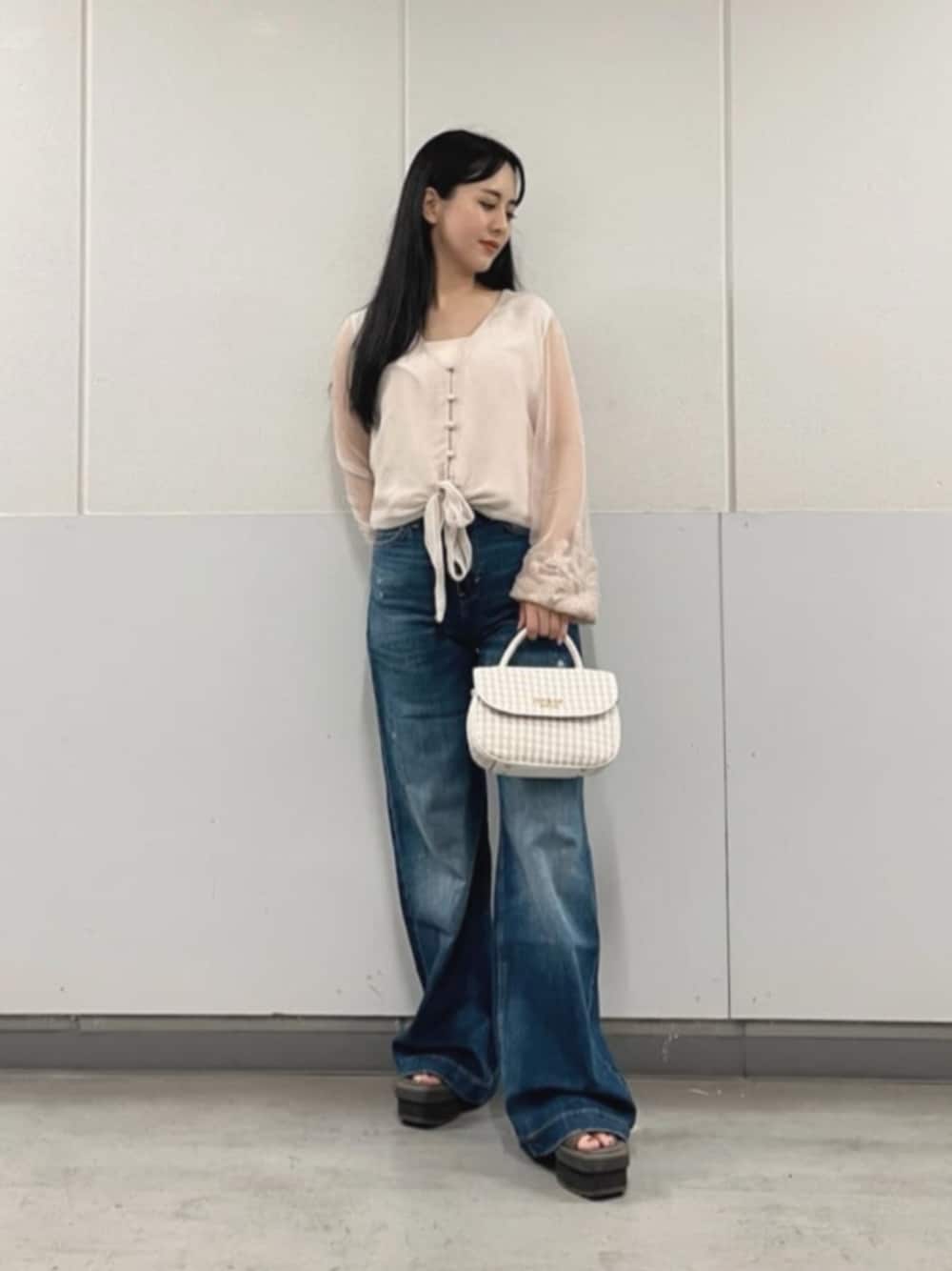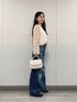 トップスはほどよい透け感となめらかな生地感、ボリュームのある袖口の刺繍デザインがコーディネートを華やかにしてくれます✨パンツやスカートだけでなく、ワンピースの羽織として使うのもオススメです☺️ デニムは下に広がってるデザインがウエスト周りは細く見せてくれます✨フィット感もありつつストレッチがきいているので動きやすいです👖 ハンドバッグはショルダーストラップ付きで2WAYで使えます!間口が広いので荷物の出し入れもしやすいデザインです♪