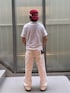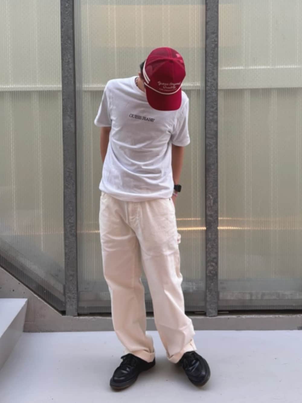 トップスはGUESS JEANSのロゴが入ったシンプルながらブランドらしいアイテムになってます。 パンツはオフホワイトのルーズシルエットで、リラックス感と抜け感があり、足元はローファーを合わせ、全体を引き締めました。赤のキャップを差し色として取り入れ、モノトーンコーデにアクセントをプラスしました。