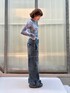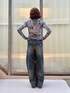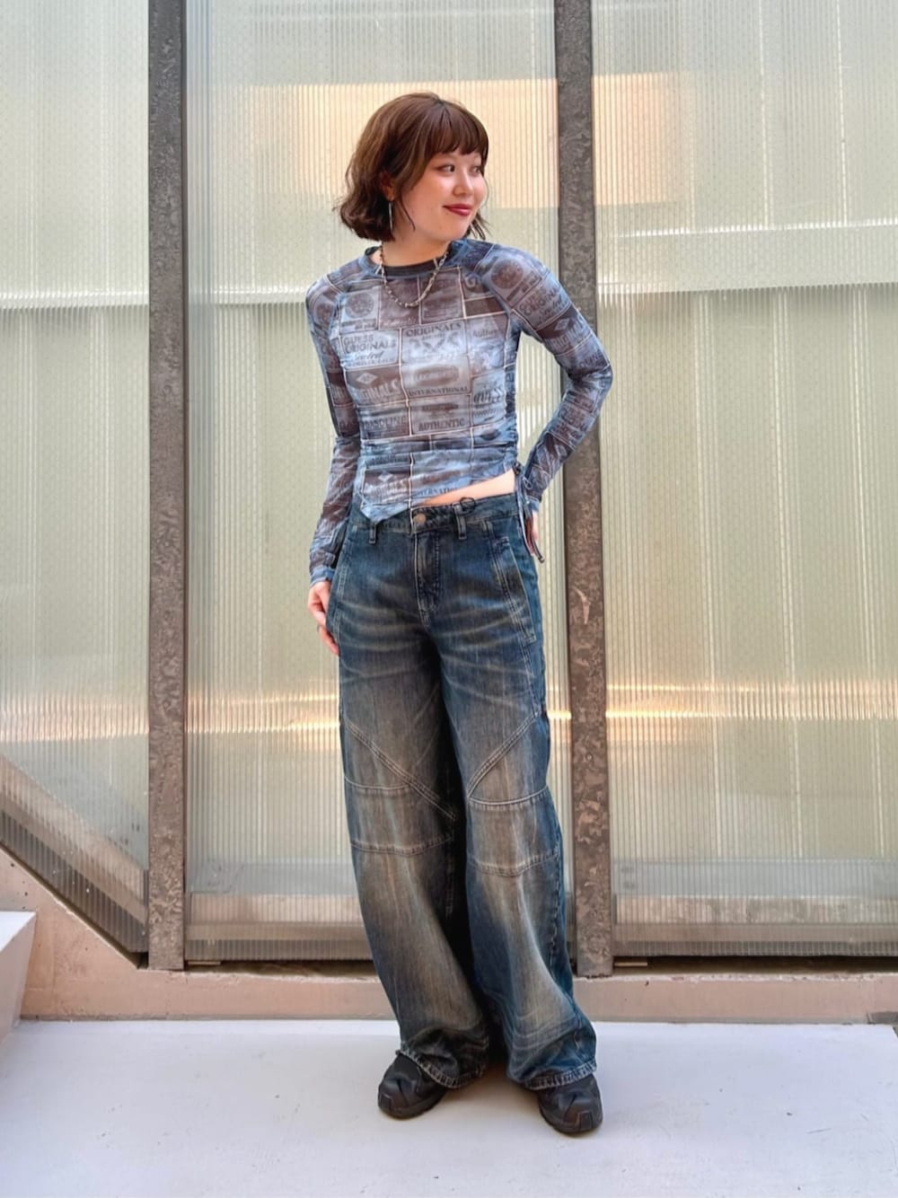 トップス(Mサイズ) → シアーの素材感がより女性らしさを演出してくれます🩷 裾はアシメになっており紐でギャザーを作ることもできるので、 シルエットの変化も楽しめます✨ アウターのインナーとしても使えること間違いなしです! デニム(26inch) → トレンドのバギーシルエットで脚のラインが綺麗に見えます✨ 少し個性的なデザインが目を惹きます👀 生地はとても柔らかいので履き心地も抜群です🎵