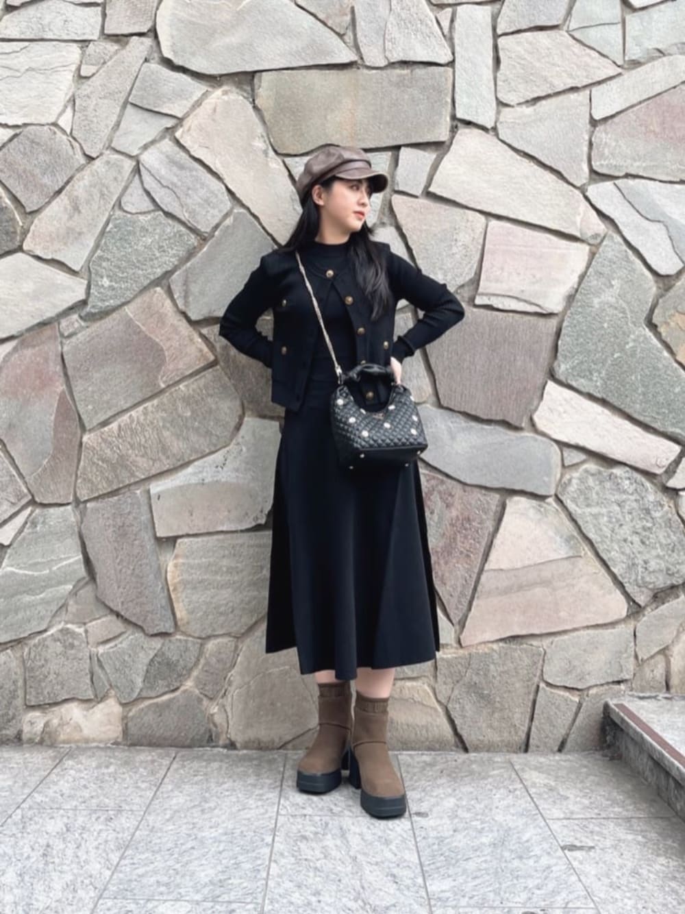 ワンピースはウエスト周りのフィット感と裾に向かって広がるミドル丈のスカートがスタイルアップしてくれます👗✨ラインがひびきにくいしっかりとした生地ですがストレッチもきいています☺︎ カーディガンはヴィンテージ感のあるゴールドのボタンがコーディネートのポイントになりそうです☺︎体にフィットしつつもストレッチもきいている着心地の良い素材です(^^) ハンドバッグは取り外しのできるゴールドのチェーン付き✨高級感のあるキルティング生地とキラッと光る花の形のストーンがコーディネートのアクセントになります!