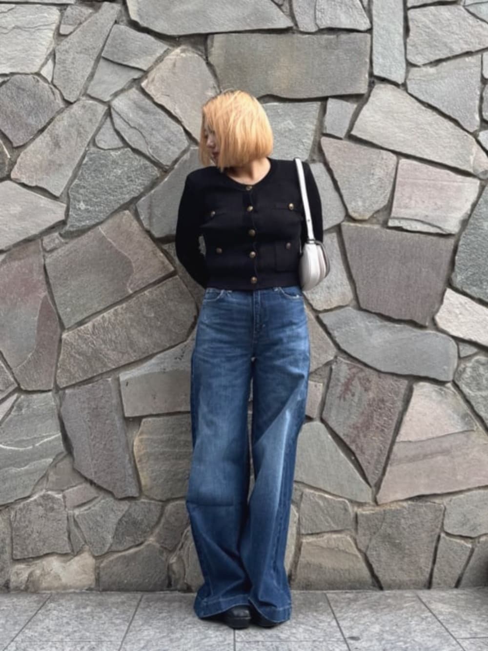 ショート丈のカーディガンにハイウエストのデニムの組み合わせがめっちゃ可愛いです〜 デニムはウエスト部分細見えするのに足はスッキリしてスタイルアップになります! ストレッチも効いてるので履きやすいですし、ショート丈との相性いいので、着回したくさんできるオススメアイテムです♡