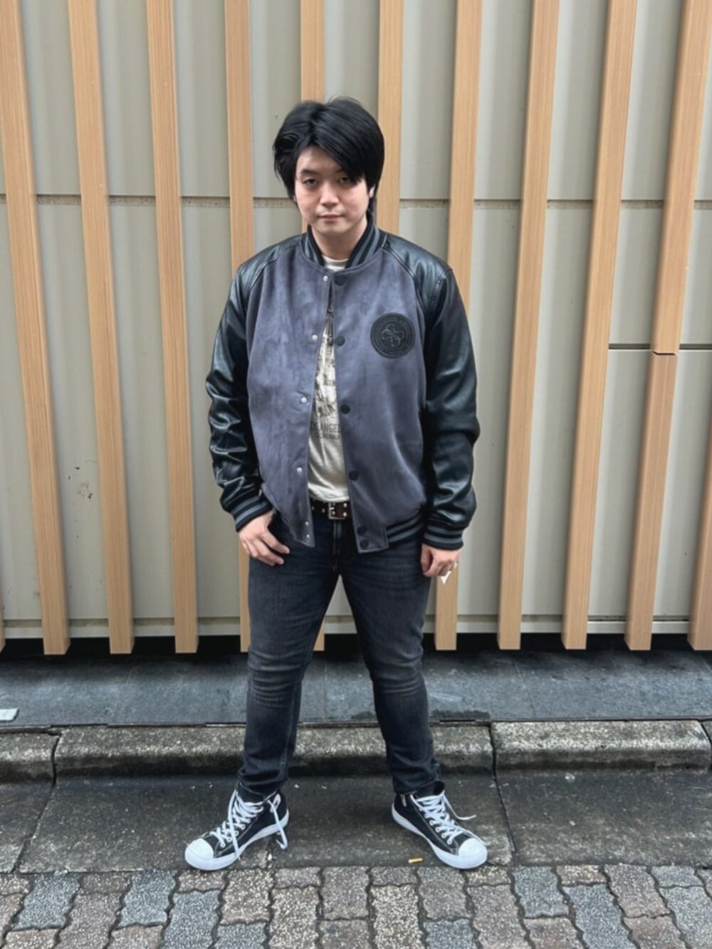 80sのロック好き学生! そんなコーデです! 黒いスリムデニムはその 象徴のようなアイテムですね!☝🏻 そこにスタジャンを合わせて 当時の学生みたいな雰囲気を作ってみました!