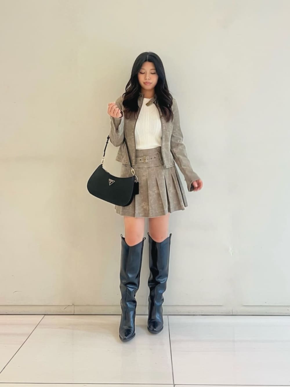 細身のシルエットのライダース風ジャケット🧥 表面にはウォッシュ加工が施されており、ヴィンテージ感も◎ 着丈もやや短めでスタイルアップも狙えます♪♪ セットアップのスカートと合わせると、統一感のあるコーディネートを楽しめます✨ もちろん、デニムやワンピースとも相性が良いので着回しもしっかりできます♪
