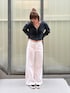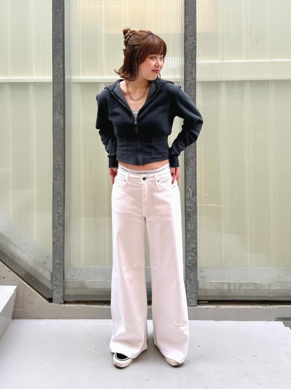 トップス(XSサイズ) →ウエストがコルセットデザインで キュッとなってるのでスタイルアップが叶います✨ 裏起毛なので暖かいです❤️ ローライズのボトムスと合わせるのがおすすめです☝🏻 パンツ(26inch) → GUESS JEANSのアイテムの中で1番ワイドのデニムです🩷 そこまで股上は短すぎないので履きやすいです! 生地も伸縮性あるので履き心地が良いですよ🎵