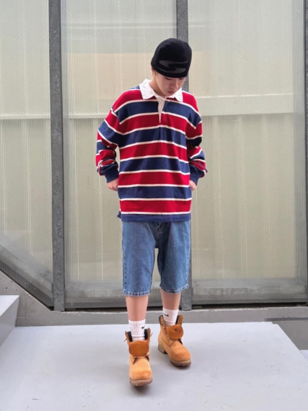 存在感のあるボーダーラガーシャツをメインに、デニムハーフパンツで軽快な印象に。 足元はボリュームのあるブーツでストリート感をプラス。 今の時期にぴったりのコーディネート。