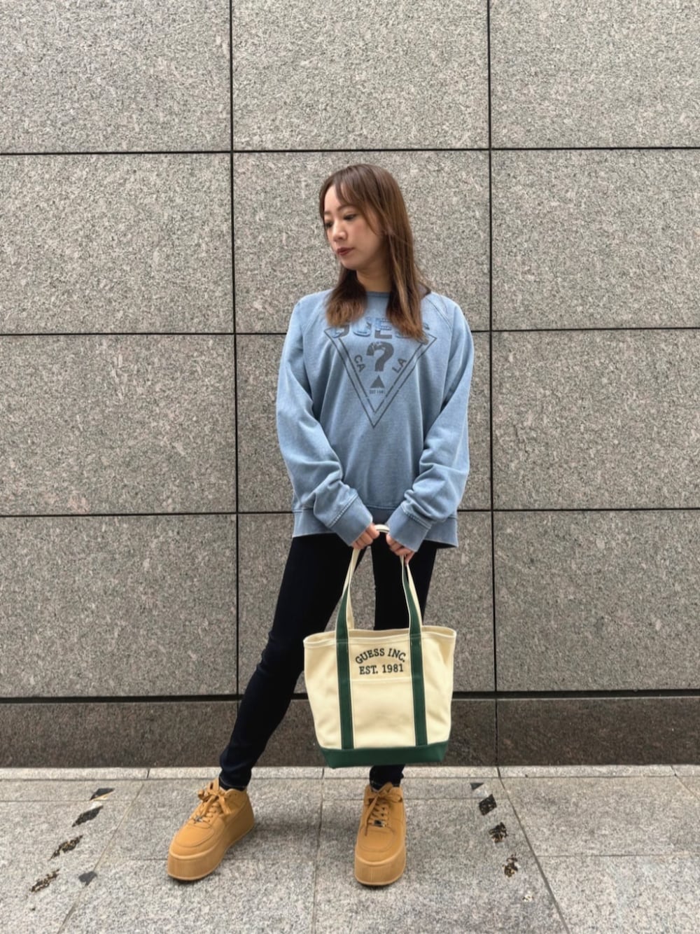 【Tops】 Sサイズ着用 オーバーサイズのメンズトレーナー✧︎*。 ゆるっとしたシルエットが可愛い♡ 【Denim】 25インチ着用 ストレッチがめちゃくちゃ効いてるスキニーパンツ✩.*˚ レギンスのような柔らかい履き心地です♡ ハイライズなのでショート丈のトップスと合わせても◎ 【Bag】 荷物の沢山入るキャンバストート~✧︎*。 ペットボトルや折りたたみ傘など色々入れれるサイズ感♡ ***ECサイトで完売商品でも、店頭でご用意がある場合もございます♥お店に電話、またはインスタのDMよりお問い合わせ下さいませ♡ ***
