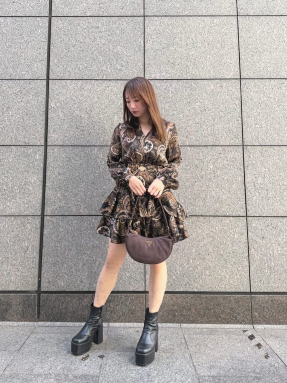 【Dress】 Sサイズ着用 胸元の開いたフェミニンな柄ワンピ~✧︎*。 Aラインかつひらひらスカートが可愛い♡♡ ベルトも着いてるのでウエストマークされて細見え~♬.*゚ 【Bag】 程よいサイズ感のスウェードBag✩.*˚ 秋冬に大活躍~✧︎*。 ***ECサイトで完売商品でも、店頭でご用意がある場合もございます♥お店に電話、またはインスタのDMよりお問い合わせ下さいませ♡ ***