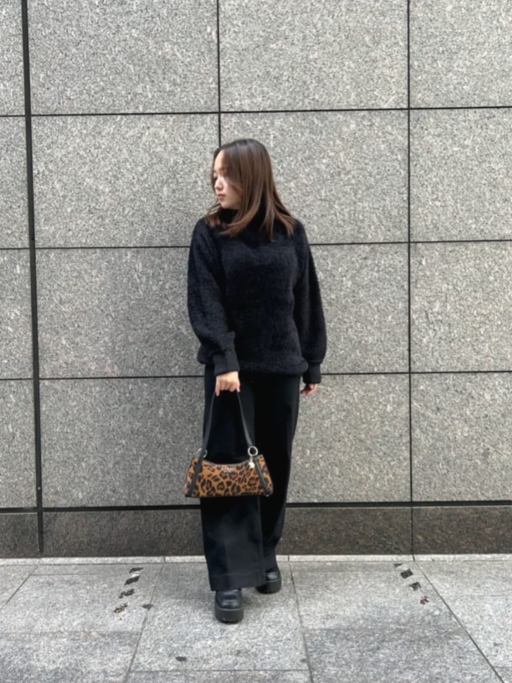 Tops𓂃꙳⋆ とってもあたたかくシンプルなニットトップスです.ᐟ ショートパンツとの相性もよくニーハイブーツのコーディネートでも大活躍✦.* オーバーサイズですෆ Denim𓂃꙳⋆ ハイライズ ベルト付きのブラックワイドパンツです♪♪ ストレッチで履きやすく綺麗なライン 長さも長すぎずちょうど良い丈感なので合わせやすく また、黒なのでトップスにも困らない素敵な一着です⚐˒˒ Bag𓂃꙳⋆ レオパード柄のハンドバッグ GUESSでは数少ない本革(牛革)のBagです.*・゚ 肌触りは気持ちよくしっかりとした生地感なのでフォーマル名場面でもお使いいただけます♪♪