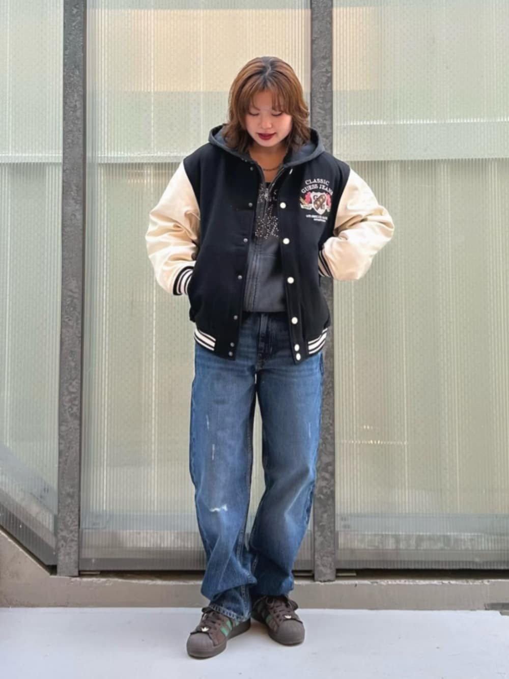 ジャケット(Sサイズ) → メンズのアイテムです! バックロゴがコーデのアクセントに👍🏻 丈も長すぎないのでバランスが取りやすいです⭕️ 肩周りもゆとりあるのでごわつかずに着ていただけます✨ パンツ(30inch) → ゆるく履きたかったのでいつもより2サイズ大きいのを着用してます! ワイドですがストレートシルエットなのでトップスも合わせやすいです⭕️