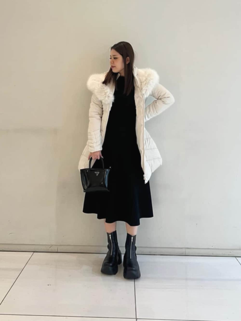 大人っぽいモノクロコーデ⛄️ ホワイト挑戦しにくい方が多いと思いますが、ウエストラインが締まってスタイルアップ効果のあるアウターなので、膨張して見えなくおすすめです🫶 バッグは、小さいですがエナメル素材で存在感がありコーディネートのワンポイントに👏 ショルダーも付いているので斜め掛けしても◎ 是非この冬お買い求めください🙂↕️