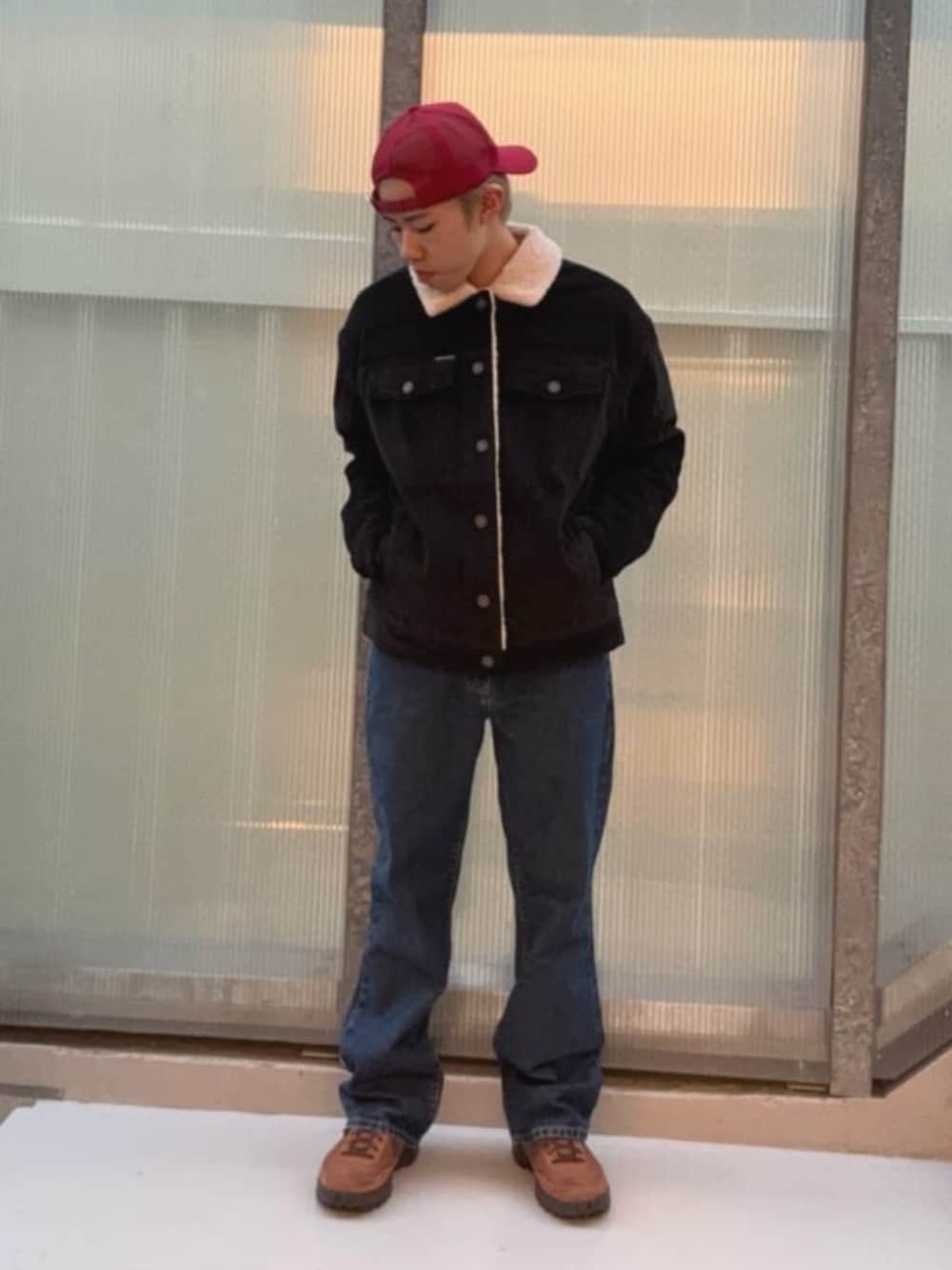 ブラックのボア襟ジャケットを主役にした、程よく無骨で落ち着きのあるカジュアルスタイル。 身シンプルなブラックながら、襟元に施されたボア素材がさりげないアクセントになり、重くなりすぎず季節感もしっかり感じられる一着です。ジャケット自体に存在感があるため、シンプルな合わせでもスタイリングが完成するのが魅力。 ボトムスには程よく色落ちしたデニムを合わせ、太すぎず細すぎないシルエットが、ジャケットのボリューム感と相性良く、全体をすっきりと見せてくれます。裾に少し溜まりを作ることで、ラフさとストリート感もプラス。 足元はブラウン系のシューズを選び、ブラック主体のスタイリングに温かみをプラス。キャップとシューズで色を拾うことで、コーデ全体に統一感を持たせています。 ジャケットは2色展開になっているので、是非店頭でご覧ください。