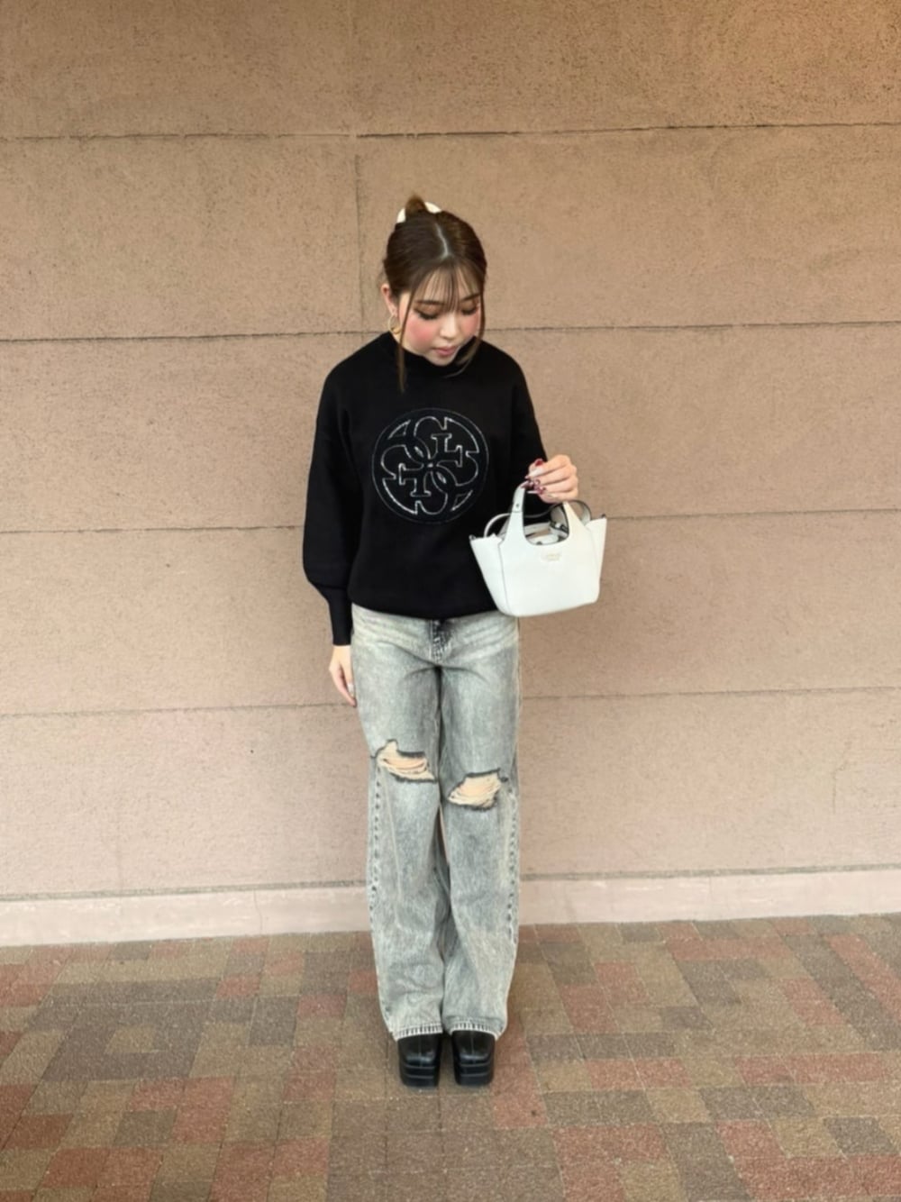 トップスは胸元の立体ロゴがポイントでシンプルだけど存在感あり😍程よくゆるっとしていて今っぽい😌 ウォッシュ感のあるデニムで膝のダメージが程よくカジュアル感プラス脚のラインが超綺麗にみえます🤭 BAGはサイズ感も丁度良くバランス◎ どこでも使える万能コーディネート🫶🏼💕