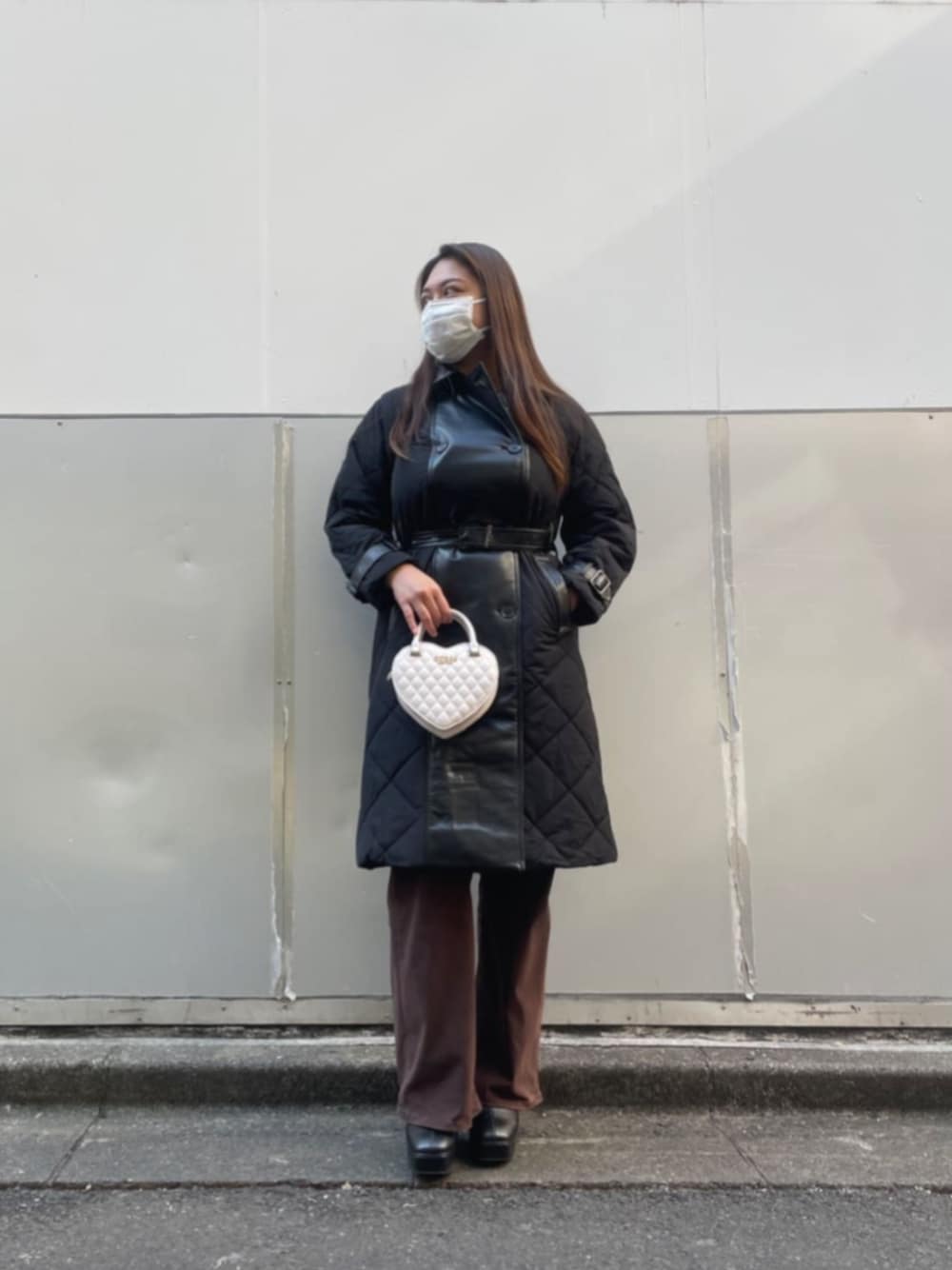 ハートの可愛いバッグがポイント! PUレザーで切替されているキルディングの中綿アウターで甘すぎないコーデにしました。 こちらのアウター、軽くいため動きやすいです。切替がオシャレなアウターなので、どんなコーデに羽織っても一気にオシャレ度アップに繋がる1枚ですね! ハートのバッグは、付属でベルトもついています。斜め掛けしてもGOODです。