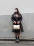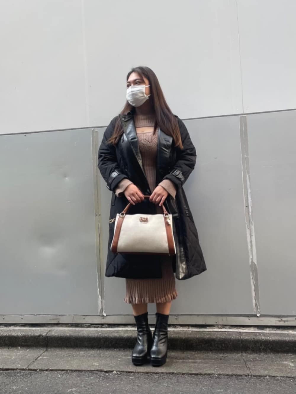 ブラウンも黒で色合いを合わせたコーデです。 こちらのブラウンのワンピースは、胸元が空いている大人な印象を与えてくれます。 PUレザーで切替されている中綿のキルティングジャケットで、カッコ良さも足してみました。 スタイリッシュなハンドバッグと合わせて、より大人な印象を感じれると思います。 A4が入るくらいのサイズ感で、オフィス用としても使えるバッグです。