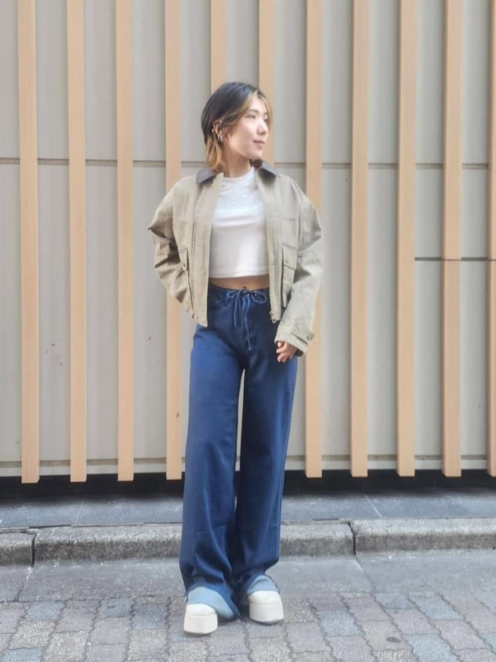 outer:XS tops:XS bottoms:24inch アースカラーが可愛いボンバージャケット。 素朴な色合いで肌なじみ良く、カラー物をあまり着ない方でも挑戦しやすいアイテムです! 袖中は狭すぎないため厚手のスウェットも重ね着出来ます◎ トップスはフェイクスウェードで手触りよく、柔らかい印象。 胸元のラインストーンが可愛いアイテムです! くびれにかかる程度の丈感のため、ヘルシーな印象に◎ ボトムスは軽くて非常に柔らかい手触り。 ウエスト含めストレッチ性抜群でとにかく履きやすいアイテムです! レングスが34inchとしっかり長めのため、厚底シューズでスタイルアップが狙えます◎