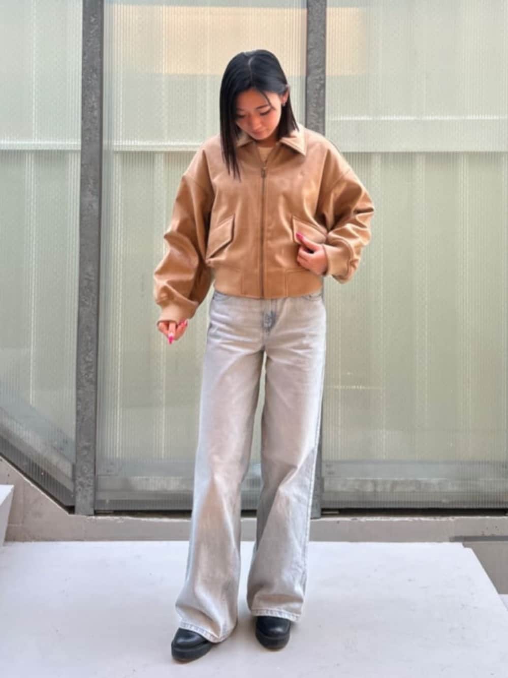ジャケット:XSサイズ 柔らかいベージュが印象的なレザージャケット。程よく丸みのあるシルエットでハードすぎず、女性らしく着られる一着🍀コンパクトな丈感なので、ボトムスとのバランスが取りやすく、自然とスタイルアップして見えます👍大きめのポケットデザインがさりげないアクセント! ボトムス:26inch ストレートシルエットのライトブルーデニム!太すぎず細すぎない絶妙なラインで、脚をまっすぐ長く見せてくれる美シルエット✨ トップスがコンパクトでもバランスが取りやすく、デイリーに活躍する万能デニム🙆♀️