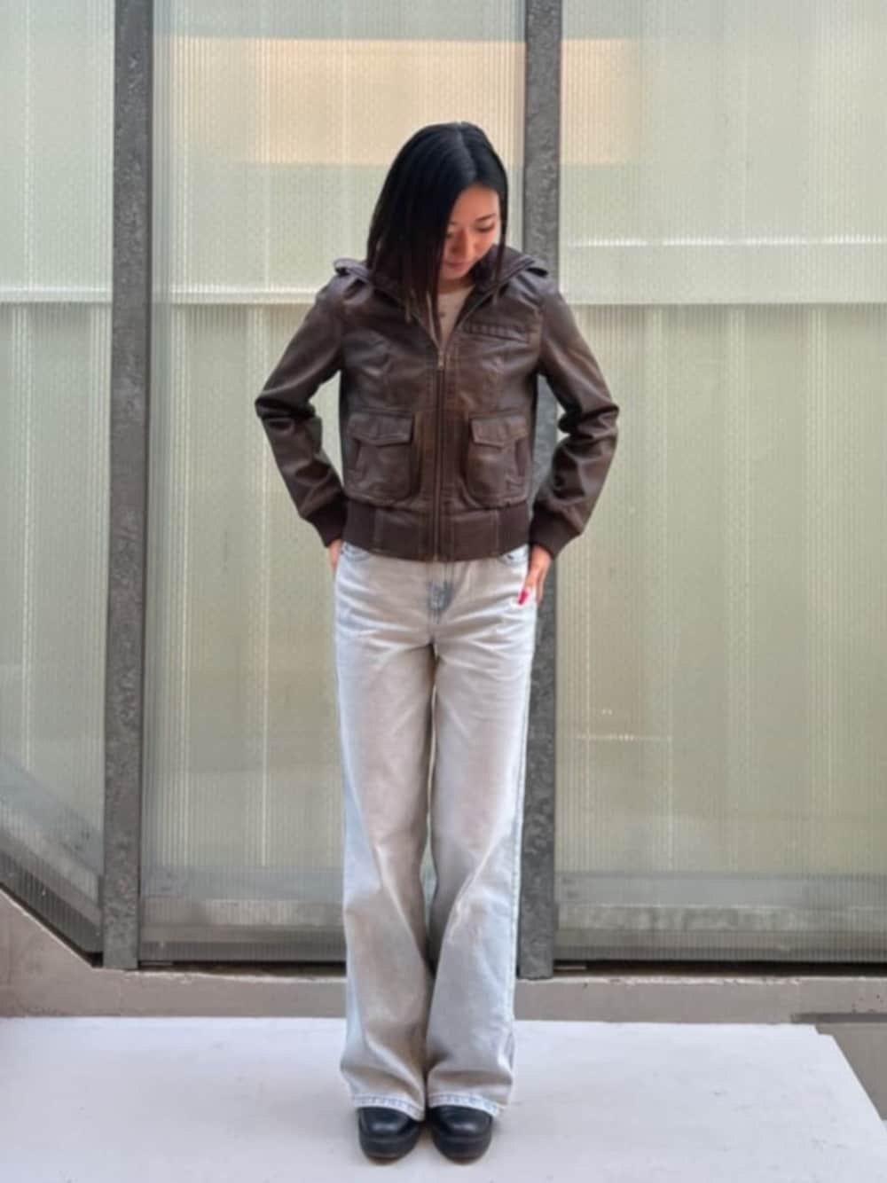 ジャケット:XSサイズ ブラウンカラーのレザージャケットは、コンパクトな丈感と程よくフィットするシルエットが特徴🔥ハードになりがちなレザーも、すっきりしたデザインで女性らしく着られる一着です❣️フロントポケットのディテールが程よいアクセントになり、羽織るだけでスタイリングに奥行きをプラスしてくれます✨ ボトムス:26inch ストレートシルエットのライトブルーデニム!太すぎず細すぎない絶妙なラインで、脚をまっすぐ長く見せてくれる美シルエット✨ トップスがコンパクトでもバランスが取りやすく、デイリーに活躍する万能デニム🙆♀️
