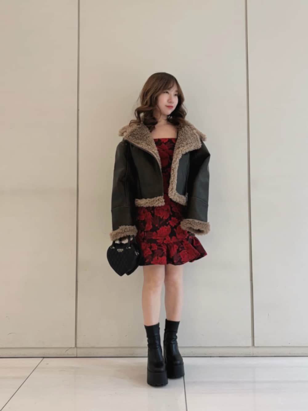 ドレスは丈感が短く、ボディラインもきれいに見えるので、セクシーなイメージに❤️ 赤い柄が情熱的で開放的な雰囲気を演出し、デートにおすすめです💋 ジャケットの裏側はボア素材でとても暖かいです😃 ブラウンカラーは大人らしく、春でも秋でも着られて、着回しやすい1枚です⭕️ ハートのハンドバッグはコンパクトですが、携帯やコスメがしっかり収納できます👌🏻 ストラップ付きで斜め掛けもできます✨ ぜひチェックしてみてください🙇