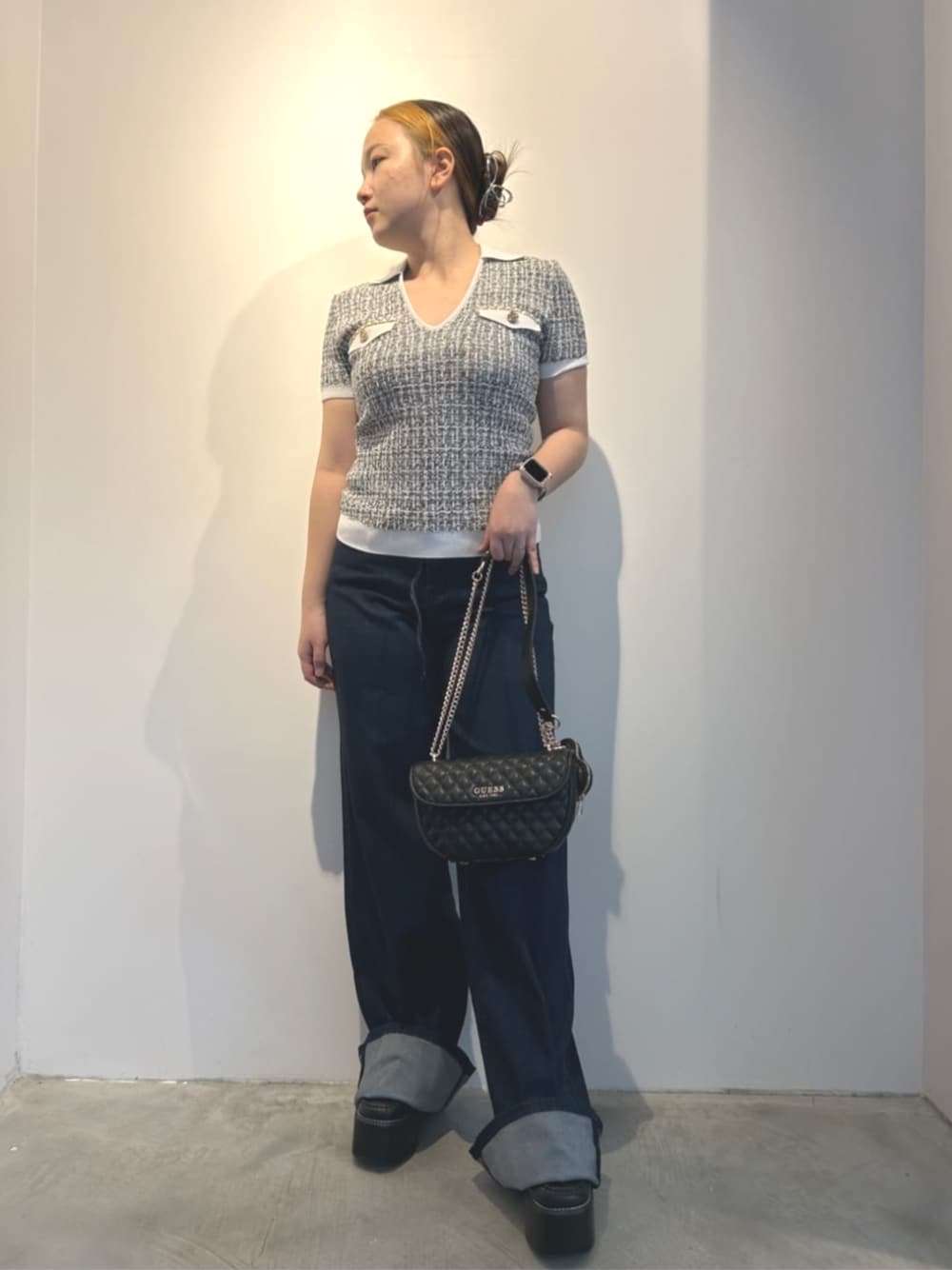 Tops𓂃 𓈒𓏸𑁍 ツイードで上品な半袖トップス໒꒱ 広めのVネックでスッキリ見せることができます୨୧ Denim𓂃 𓈒𓏸𑁍 長めの太いワイド˖ ࣪⊹ ボタンの前には結ぶ紐があり蝶蝶結びでショートトップスの際に可愛いポイントになりますෆ Bag𓂃 𓈒𓏸𑁍 プリティなショルダーバッグ❤︎ ハートの小物入れがとっっっても可愛いです✦.* また、ショルダーとハンドバッグの2Wayで使いやすいフラップ式でガバッと出し入れできます𝜗𝜚˚⋆