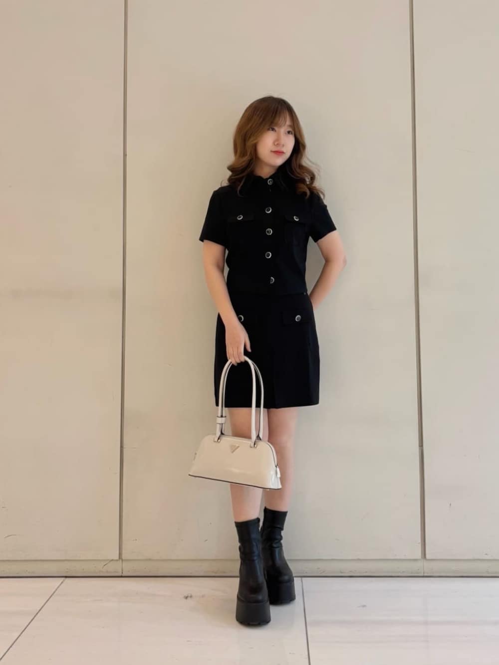 ブラックのセットアップは正式感があり、オフィス用にもオススメです💼 キラキラしたボタンが付いて大人っぽくオシャレな印象になります😎 バッグはさまざまなコーデネートに合わせやすいデザインです♪ 長財布を収納できるサイズなので実用性⭕️ ぜひチェックしてみてください🖤