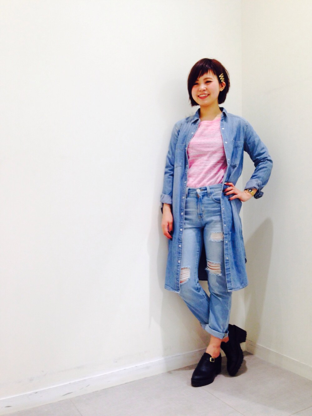 デニム×デニムコーデです! こちらのクラッシュデニムは大人気で在庫も残りわずかです!お見逃しなく!(*^^*)