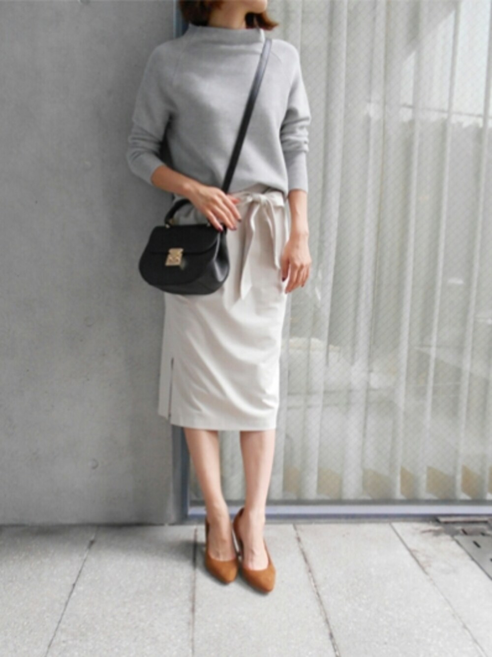 ボトルネックのプルオーバーに季節感のあるスエード素材のスカートをあわせたコーディネート。キャメルのパンプスがポイントです♪