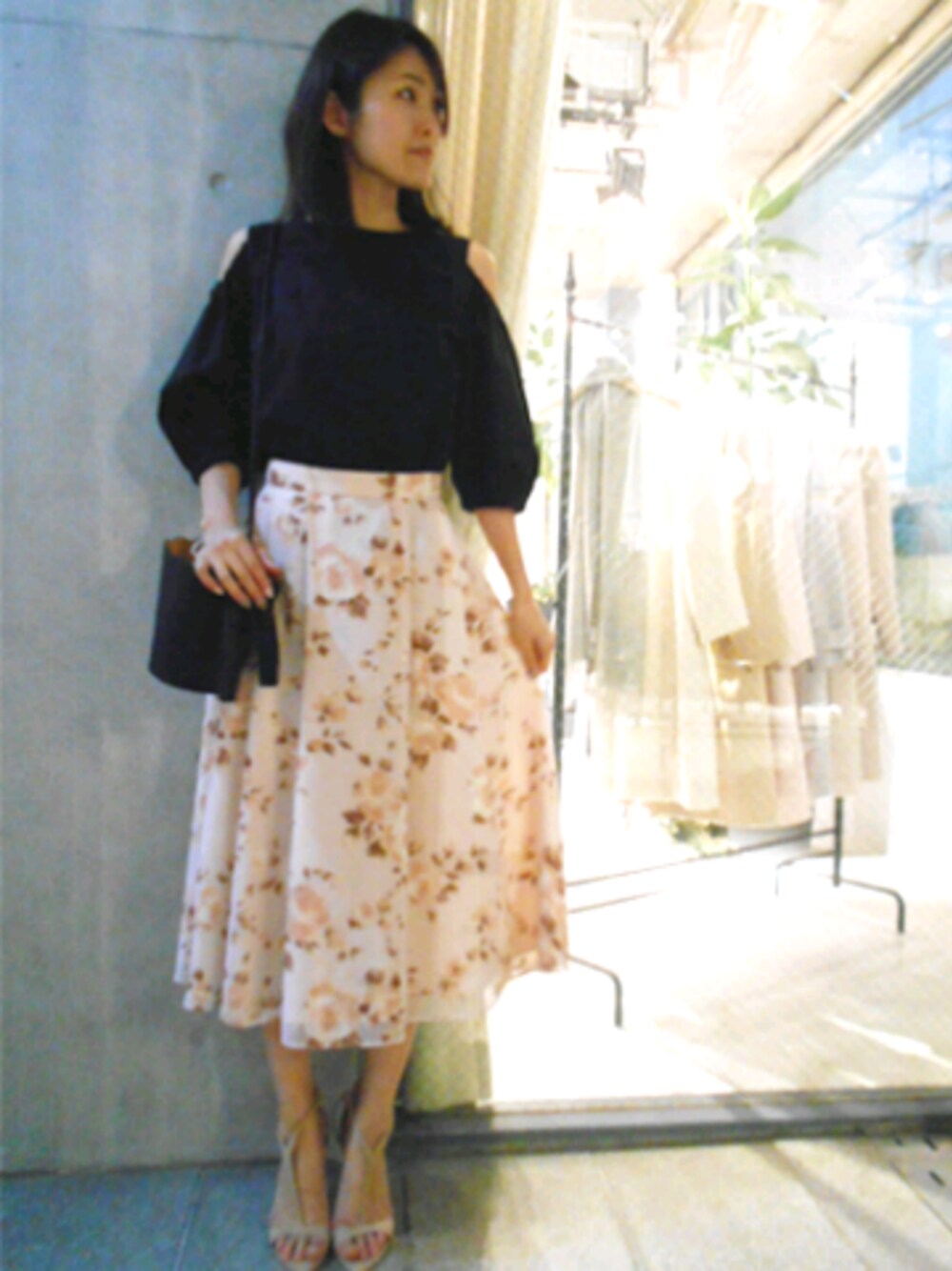 大胆な肌見せブラウスは花柄スカートで大人可愛く♪