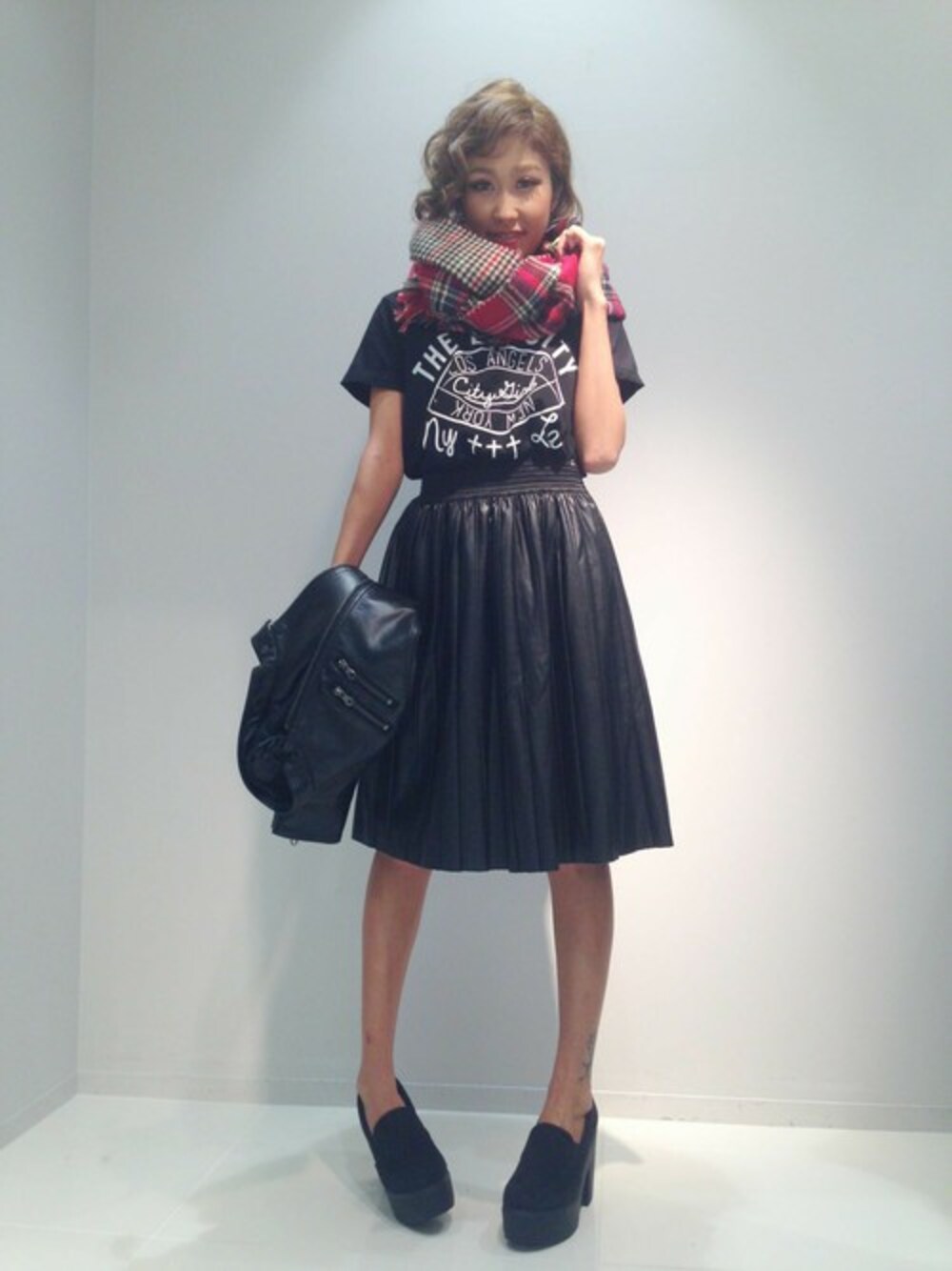 秋のトレンドアイテム【ミモレ丈スカート】をレザーにすることでカジュアルに♪チェックのストールがアクセントになってます。