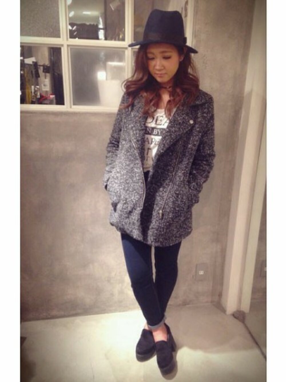 STAFFのライダースジャケット「ツイードライダース風コート」を使ったコーディネート