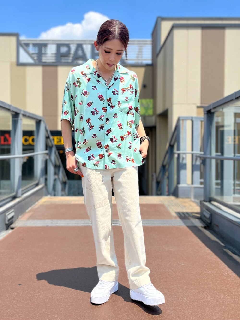 総柄シャツに涼し気な白ボトムで🌞💚 半袖シャツは生地感テロっとしていてゆったり着れました‼️ 中はタンクトップで合わせてます‼️ 前ボタン開けて着ても良しですね〜︎👍🏻 ̖́- ボトムは、ストレッチがきいているので履きやすかったです⭕️ さり気ないプリントがまた可愛いですよね🥺 通販可能です🙆♀️ AVIREX DEPOT入間 📞04-2902-5073