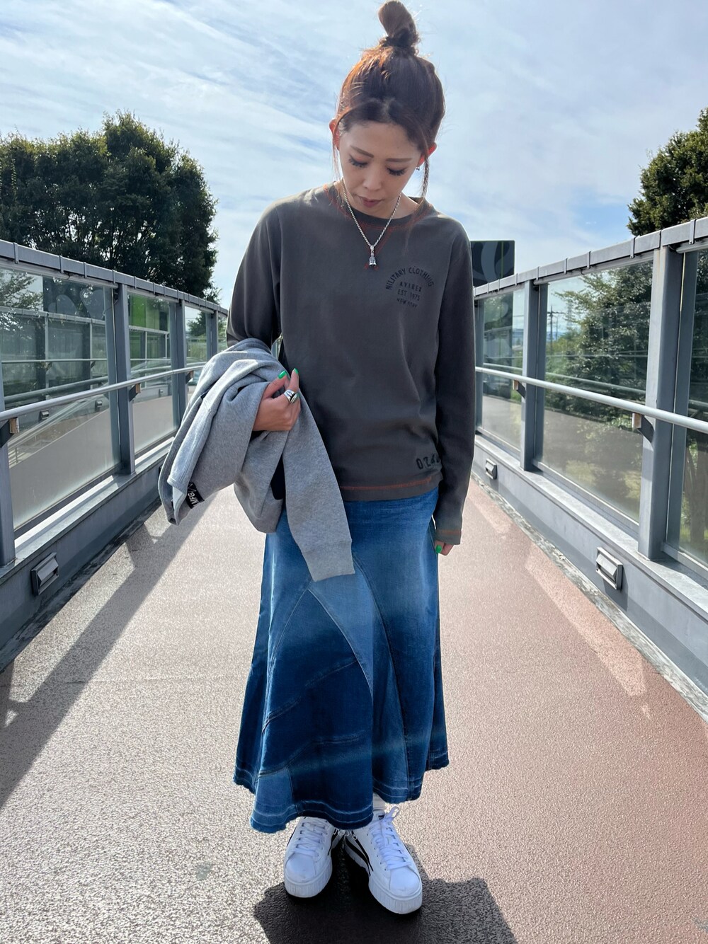 涼しくなってきましたね🥺 前回の色違いのロンTをつかった コーディネートです‼️ デニムのスカートはウエスト後ろ部分がゴムになっており、足回り自体もストレッチが効いてるので履きやすいですよ😳 ロンTはステッチのカラーがポイント︎👍🏻 ̖́- 通販可能です🙆♀️ AVIREX DEPOT入間 📞04-2902-5073