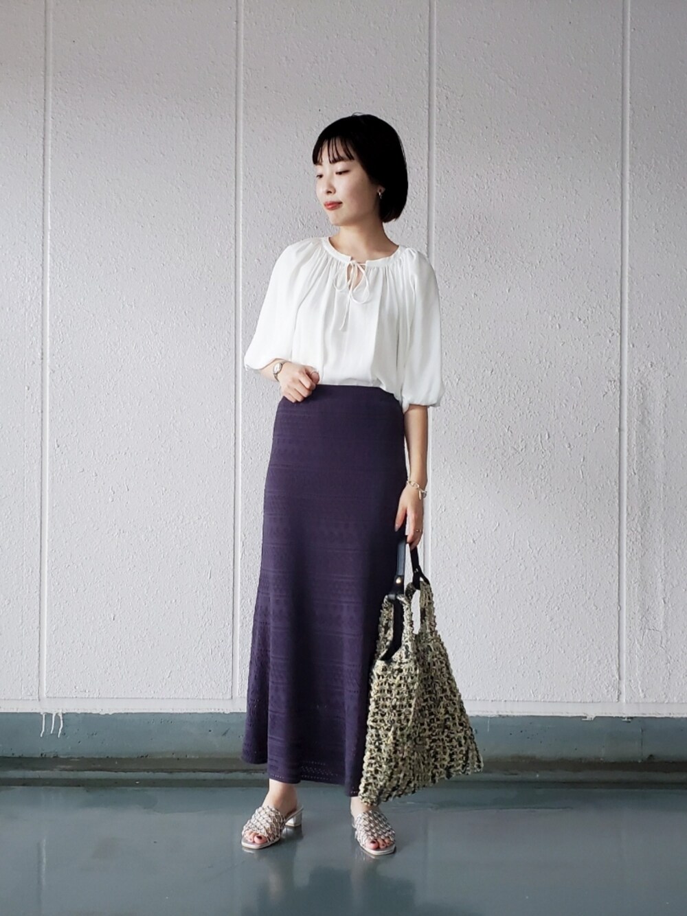 クリアホワイトのブラウスとネイビーのニットスカートのコントラストが素敵なお出かけスタイルです。 サンダルをアクセサリーとお揃いのシルバーカラーで合わせて、よりクールな大人っぽいニットスカートコーデにしました。