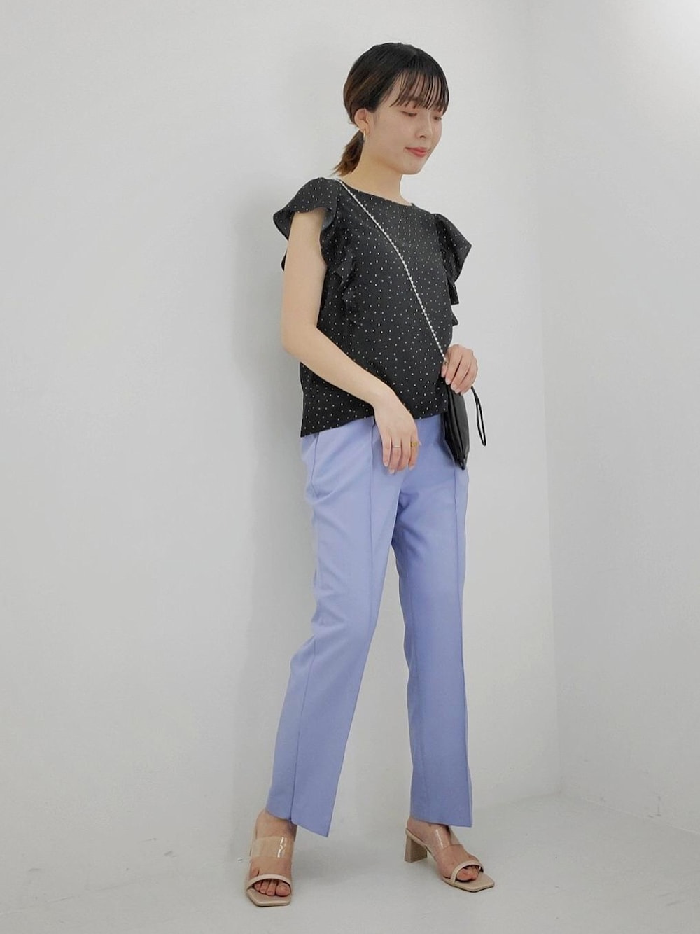 大人気のらく美パンツは、腰回りやヒップも綺麗に見えるので、コンパクトなトップスを合わせてみました♪ 控えめな袖のフリルや、小さめのドットが上品です。