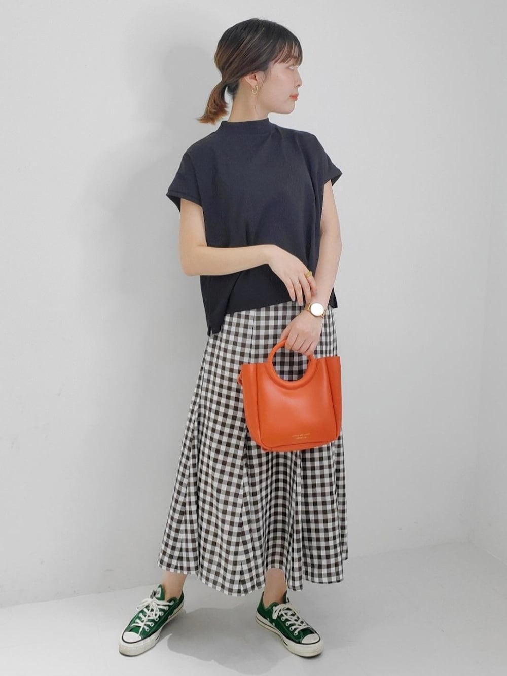 トップを濃い色にすると、インパクトのあるボトムを履いても全体的に締まります♪ギンガムチェックがよく生えて可愛いです♪