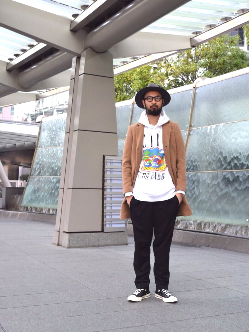 インナー、ボトムスはルーズなサイジングで合わせ、コートはあえてのタイト目サイジング。CAPになりがちなコーディネートもハットにした事により一気に大人らしさが増す。