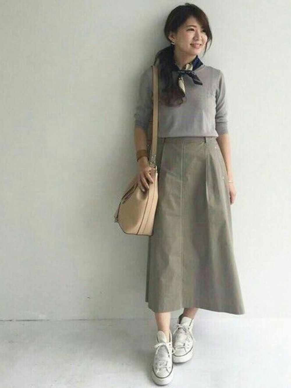こんばんは(^^) 日曜日の夜、今日の休日大人カジュアルスタイルを共有しますね♪ 最近ベージュやグレーのワントーンコーデが好きです。 カジュアルだけどきれいめな印象に仕上げてくれる、美シルエットのテントラインマキシスカート。これをはきたい気分だったので、ニュアンストーンで上質素材のシンプルニットをイン♪ これだけで、大人っぽくておしゃれ上手な感じが簡単に出せます。 マイブームでもあるスカーフで華やぎポイントは必須です☆ リラックスした気分でスニーカーを合わせましたが、バッグやアクセはきれいめでまとめてバランスをとるのがミソですよ(^^)v さぁ、明日からがんばりますかっ