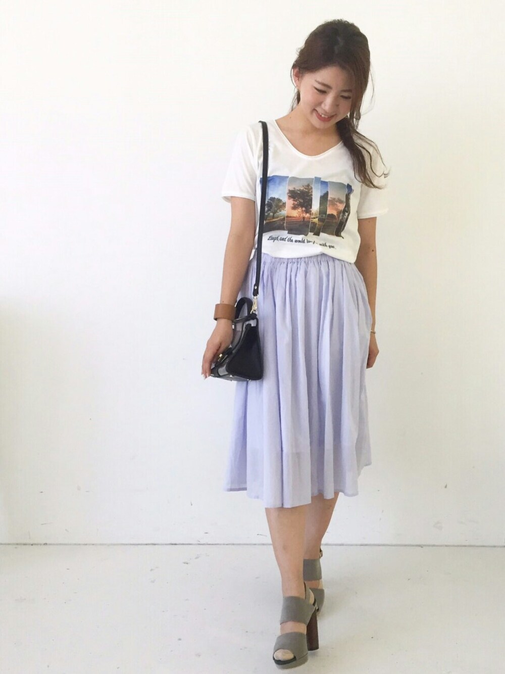 こんばんは! 今日はほんと、夏みたく暑い1日でした。 そんな日は、楽チンなTシャツを選びがちな私。 でもなんでもないTシャツじゃなくて、クリーンさとトレンド感を漂わせてくれる、デザインTシャツだと着映えもするしこなれて見せてくれますよ。 このTシャツにデニムだとただのカジュアル!ボトムスはあえてフェミニンで女性らしいテイストを持ってきて、ハズシの効いたコーデにまとめました♪ ふんわりきれいな色のスカートは女心が盛り上がりますっ(*^^*)