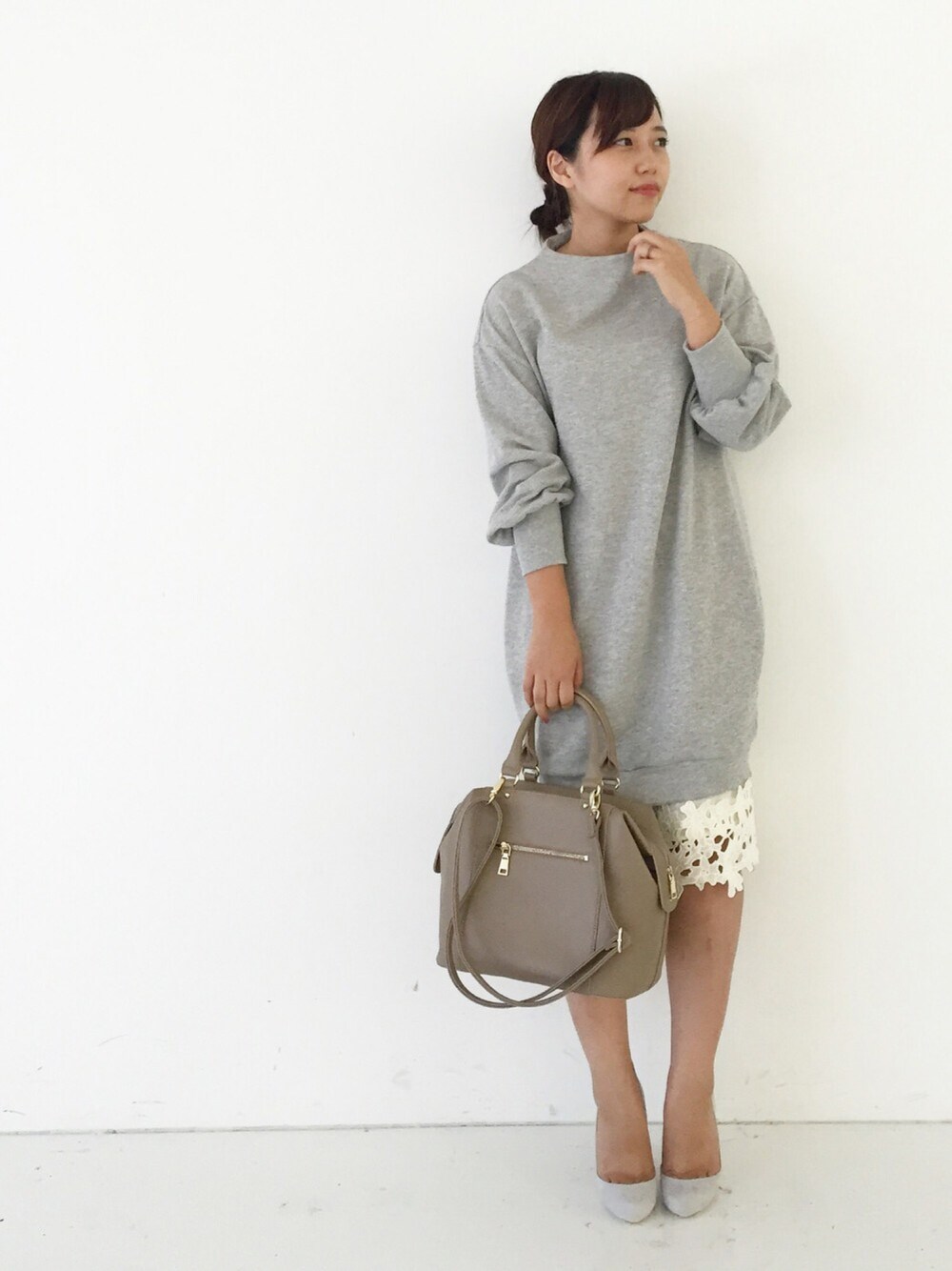 ayapiのワンピース「女っぽい絶妙レイヤードが完成する甘編みスウェットワンピ&すそレースペチスカートセット 」を使ったコーディネート