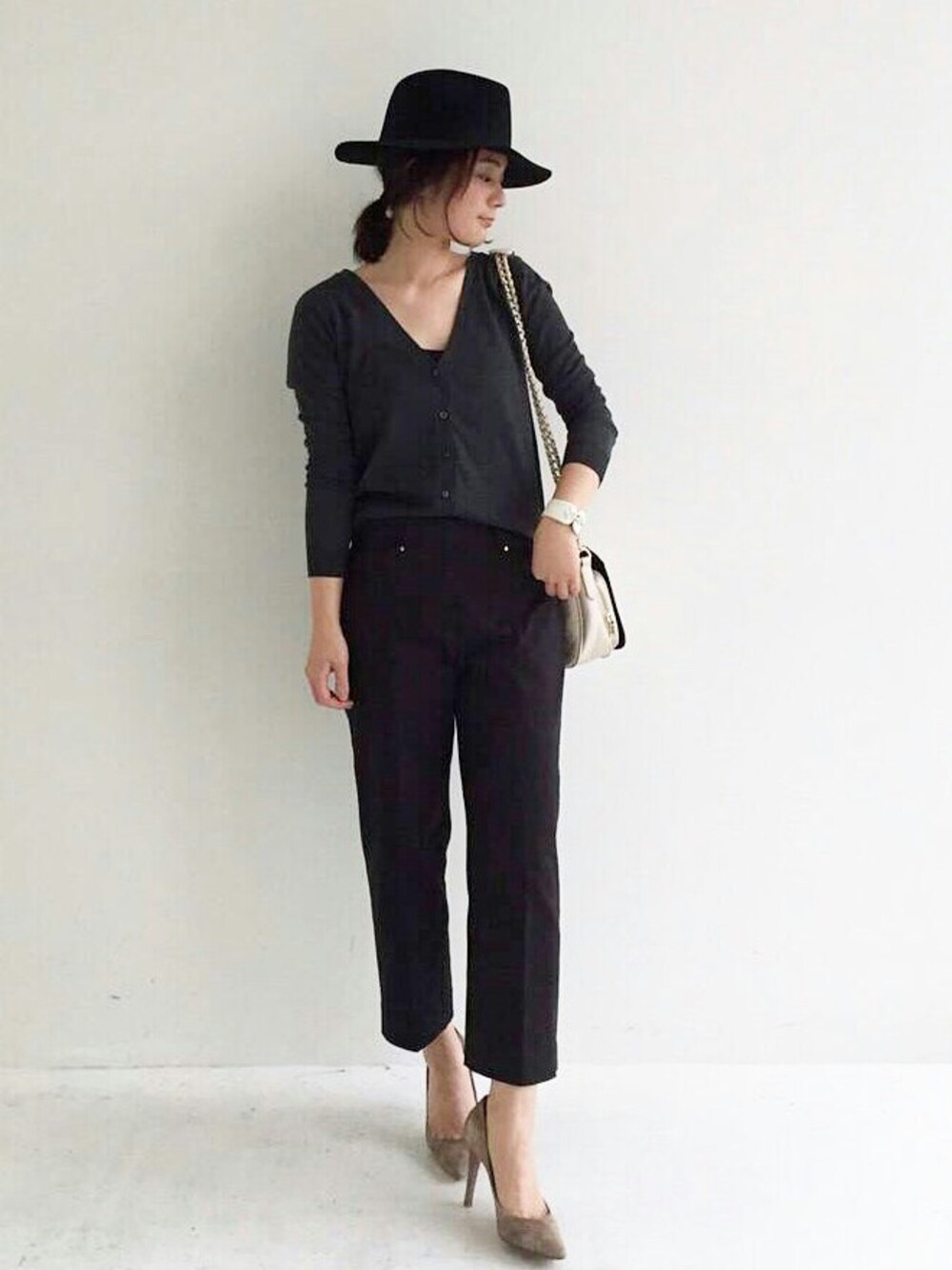 今年は定番のVネックカーデもボタンを留めてニットみたいにインして着たい気分。紫外線対策には羽織りとしても、もちろんオススメです。 ストレッチのきいたパンツは履き心地がいい上にワイドなのにすっきり見える、絶妙シルエットで体形もカバーしてくれて頼れる一本!