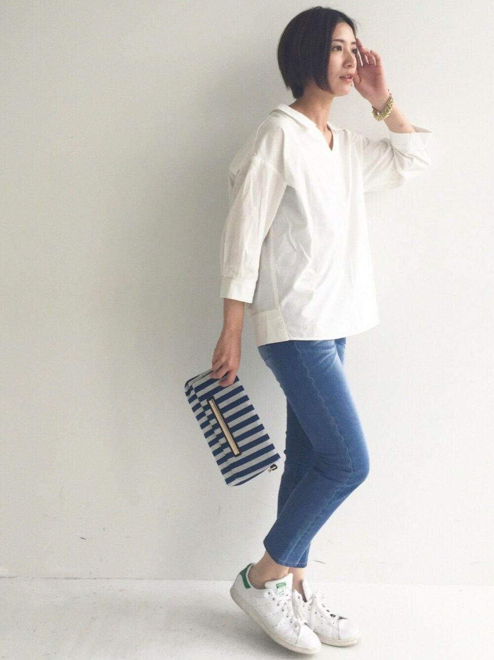kecoのシャツ/ブラウス「リブ イン コンフォート ゆるシルエットできゃしゃ見せ フロントインしているみたいなこなれスキッパー風プルオーバーシャツ」を使ったコーディネート