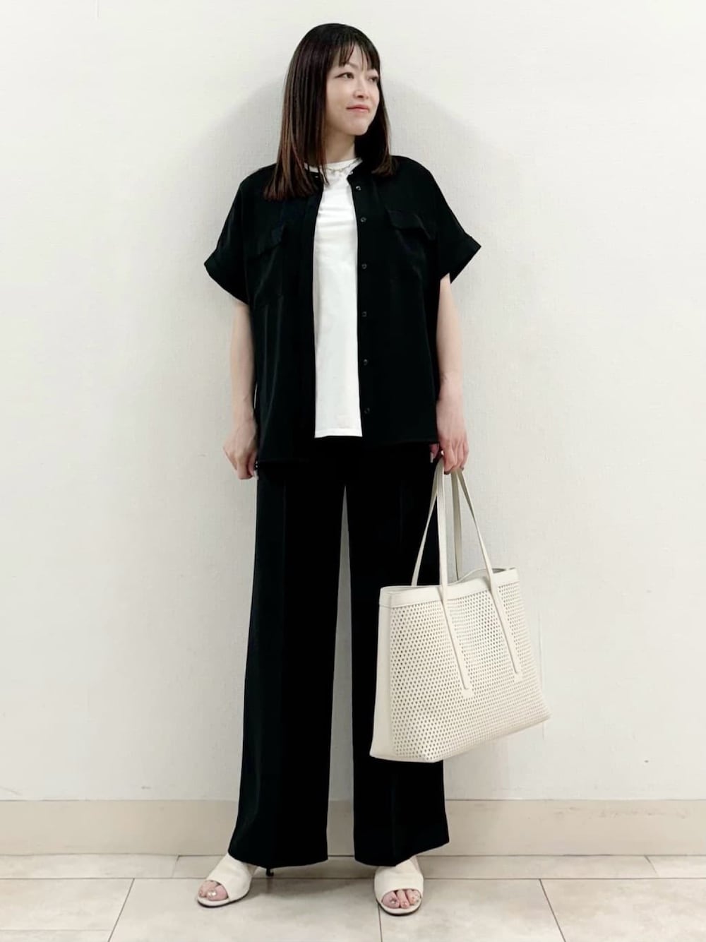 【waka_157cm_店舗名小倉井筒屋INDIVI】 "こなれSET UP"シリーズのブラウス×パンツのセットアップスタイリングです。 ブラウスは前をあけて羽織りで着てみました。インナーのTシャツは、そのまま着るとお袖が出るので二つ折りして着てます。 ブラウス、Tシャツは38サイズ、パンツは36サイズを着用、8cmヒールのサンダルを履いてます。 ※1番最後の写真にブラウスのボタンを全部とめて、スカートと合わせたスタイリングも載せてます。 画像、右下♡マークを押すと簡単に見返すことが出来ます! 是非ご活用下さい。 Instagram ▶︎ @indivi__official