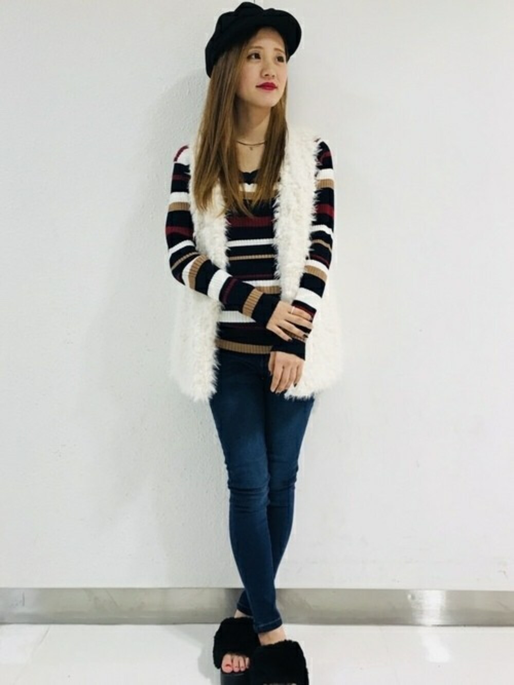 今年流行りのファーベストをマルチボーダーとカジュアルめに合わせました。 ベストは着心地も良く軽いので長時間着ていても楽です。